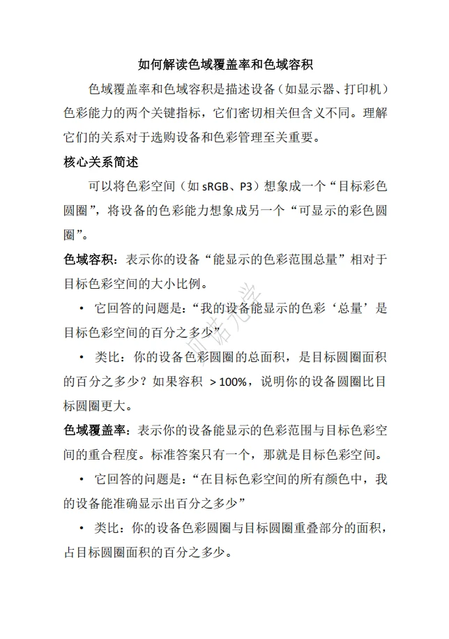 欢迎来到杭州贝诺光学科技有限公司网站!色域覆盖率和色域容积是描述设备(如显示器、打印机)色彩能力的两个关键指标,它们密切相关但含义不同。理解它们的关系对于选购设备和色彩管理至关重要。核心关系简述可以将色彩空间(如 sRGB、P3)想象成一个“目标彩色圆圈",将设备的色彩能力想象成另一个“可显示的彩色圆圈"。色域容积:表示你的设备“能显示的色彩范围总量"相对于目标色彩空间的大小比例。· 它回答的问题是:“我的设备能显示的色彩‘总量’是目标色彩空间的百分之多少"· 类比:你的设备色彩圆圈的总面积,是目标圆圈面积的百分之多少?如果容积 > 100%,说明你的设备圆圈比目标圆圈更大。色域覆盖率:表示你的设备能显示的色彩范围与目标色彩空间的重合程度。标准答案只有一个,那就是目标色彩空间。· 它回答的问题是:“在目标色彩空间的所有颜色中,我的设备能准确显示出百分之多少"· 类比:你的设备色彩圆圈与目标圆圈重叠部分的面积,占目标圆圈面积的百分之多少。关键关系与区别1. 没有简单的换算关系:· 覆盖率不能直接从容积推导出来,反之亦然。一个设备可能有很高的容积,但覆盖率却很低。2. 四种典型情况:· 理想状态(容积 ≥ 100%, 覆盖 ≈ 100%):设备色彩范围全覆盖并可能超越了目标色彩空间。这是专业显示器的目标,例如一台显示器覆盖了 100%的 P3色域(覆盖率高),同时其色彩范围总量可能达到 sRGB 的130%(容积大)。· “大而不准"(容积 > 100%, 覆盖 < 100%):设备能显示非常鲜艳、广阔的色彩(容积大),但这些色彩超出了目标范围,同时目标范围内的某些颜色它却无法显示(覆盖率低)。这会导致色彩过饱和或失真。一些低质量的广色域显示器可能出现这种情况。· “精准但有限"(容积 ≈ 100%, 覆盖 ≈ 100%):设备色彩范围与目标空间几乎全重合。这是优秀的sRGB 显示器的特征,色彩准确但不够鲜艳。· “能力不足"(容积 < 100%, 覆盖 < 100%):设备色彩范围小于目标空间,既无法显示所有目标颜色,色彩总量也不足。这是低端设备的常见情况。从图 1-1 可明显看出 定义标准 sRGB 为目标色 100%,但是没有全覆盖,反而相对于目标色,色域容积为 125%。通过图 1-2 即可明显看出相对于目标色,在某个色域空间缺失。实际应用与选购建议· 对于色彩准确性要求高的工作(如摄影修图、平面设计、印刷):色域覆盖率是更重要的指标。 你需要确保设备能准确还原你工作的色彩标准(如 sRGB、Adobe RGB)。